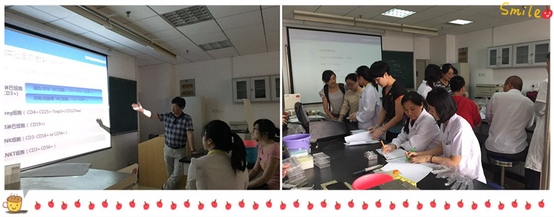 達科為生物第三屆流式培訓班——武漢分站實驗上機培訓于1024-25日在華中科技大學同濟醫(yī)學院基礎2號樓9進行。本次實驗內(nèi)容為人外周血的T/B/NK/NKT/Treg的流式檢測,流式細胞儀型號為BD LSRⅡ,為雙激光六色儀器,本次實驗panel共分成兩,檢測T/B/NK/NKT,一組檢測Treg。實驗采取小組教學,上機學員共計60。