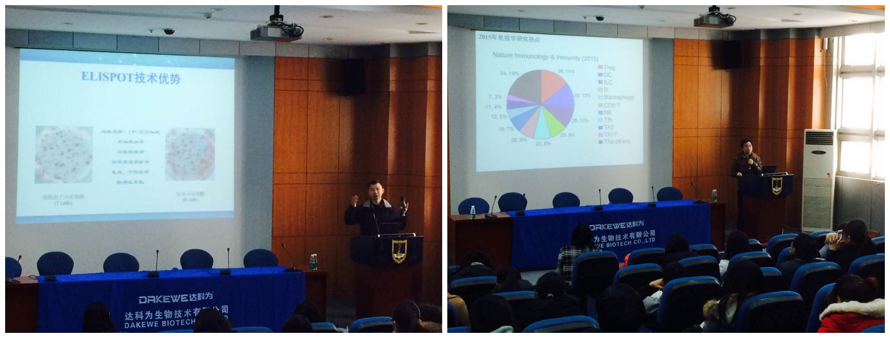 1月8日上午九點(diǎn),第二天的理論課程開(kāi)始了。首先是達(dá)科為生物工程中心周翔經(jīng)理作報(bào)告。周翔經(jīng)理講述了ELISPOT的原理、刺激劑的選擇、斑點(diǎn)結(jié)果判定以及ELISPOT的應(yīng)用等。