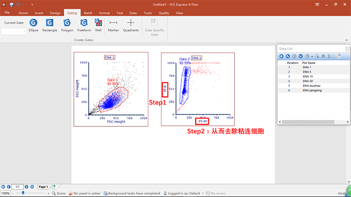 a.粘連細(xì)胞去除之后,可直接調(diào)用Denovo自帶的細(xì)胞周期分析模板,完成數(shù)據(jù)分析,具體操作如下: