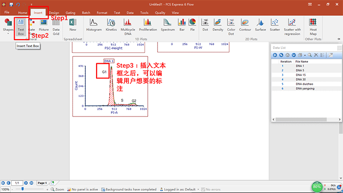 b.將細(xì)胞周期分析的模板調(diào)出來之后,點(diǎn)擊OK,會(huì)彈出如下圖所示的界面,然后可以利用insert按鈕,插入文本框,從而可實(shí)現(xiàn)圖注的編輯,如下圖所示(我們可以對圖中的每個(gè)峰進(jìn)行命名,從而可以對細(xì)胞周期中的各個(gè)時(shí)期進(jìn)行命名和解釋):