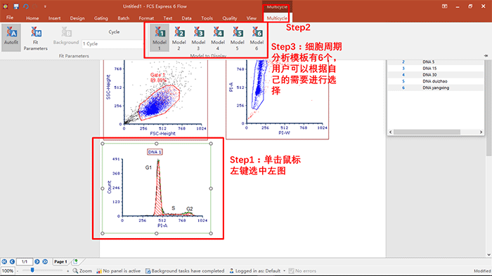 a.在細(xì)胞周期分析的模板中,有不同的模板可以調(diào)用,用戶可以根據(jù)自己的需要,選擇相應(yīng)的細(xì)胞周期數(shù)據(jù)分析模型,具體操作如下圖所示: