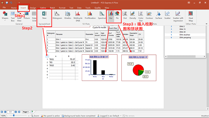 a.舉例,對細(xì)胞周期中G1期,S期及G2期各細(xì)胞比列的情況分析并做成柱形圖及餅狀圖,直接插入Spreadsheets,然后將相應(yīng)的數(shù)據(jù)拖拽入表格中,點(diǎn)擊insert命令按鈕,插入相應(yīng)的柱形圖和餅狀圖,操作如下: