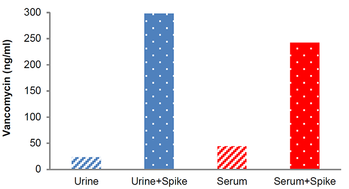 加標(biāo)回收實(shí)驗(yàn): 人血清和尿液樣本加300ng/ml的萬古霉素,回收率為80-100%。