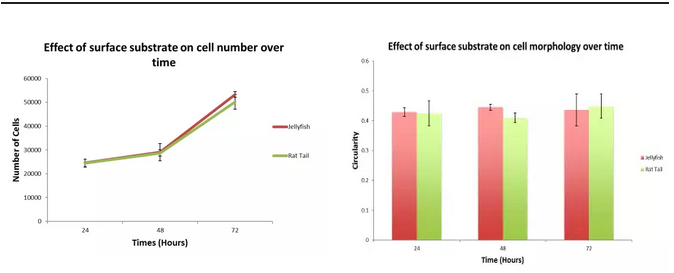 細(xì)胞培養(yǎng)72h結(jié)果顯示,在水母膠原(紅)上生長的細(xì)胞與在大鼠尾膠原(綠)上生長的細(xì)胞,細(xì)胞增殖水平和細(xì)胞形態(tài)接近。Jellagen是哺乳動(dòng)物膠原蛋白良好的替代物。