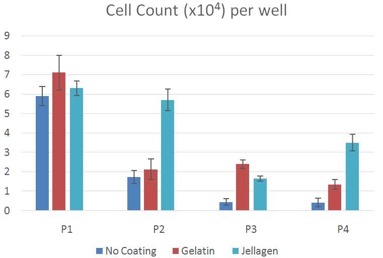 Jellagen膠原蛋白不僅具有良好的細(xì)胞兼容性、細(xì)胞粘附性,還可以為細(xì)胞提供充分的營養(yǎng)。在基質(zhì)支持軟骨細(xì)胞生長過程中,Jellagen膠原上生長的軟骨細(xì)胞同在牛明膠上生長的軟骨細(xì)胞比較,細(xì)胞在P4時(shí)存活率更高。