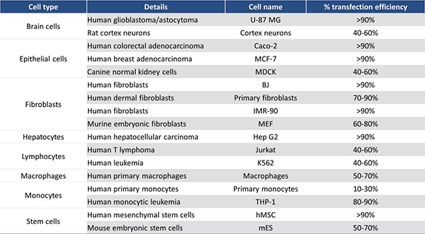 Table 1  jetMESSENGER?可在各種細(xì)胞類型中獲得高轉(zhuǎn)染效率