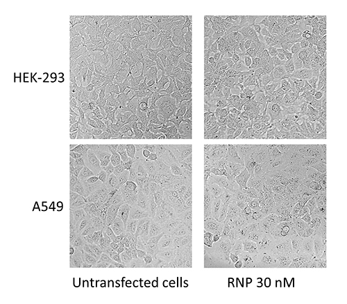 在96孔板中用30nm RNP(Cas9蛋白和HPRT1 sgRNA)和0.3 μl的jetCRISPR?轉(zhuǎn)染HEK-293和A549細(xì)胞,轉(zhuǎn)染48h后,使用phase contrast ZOE Fluorescent Cell Imager (BIORAD?)觀察細(xì)胞狀態(tài)。