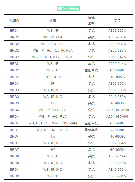 Bethyl認(rèn)識到BRD4在細(xì)胞周期調(diào)控和腫瘤發(fā)生中的重要性,研發(fā)了質(zhì)量優(yōu)秀的BRD4抗體,以及許多其他相關(guān)蛋白質(zhì)的抗體,以促進(jìn)癌癥研究發(fā)展。