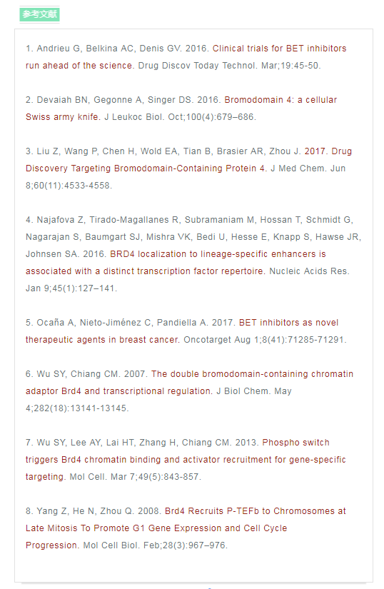 BRD4(溴結(jié)構(gòu)域蛋白4)是一種轉(zhuǎn)錄調(diào)節(jié)因子。研究發(fā)現(xiàn),BRD4在癌癥、自身免疫和炎癥性疾病中具有重要的作用1,2。 正常生理情況下,BRD4主要參與細(xì)胞周期過程中的基因表達(dá)調(diào)控,其可以與乙酰化染色質(zhì)結(jié)合,保持各種基因在細(xì)胞分裂循環(huán)過程中的穩(wěn)定表達(dá) ,這種現(xiàn)象被稱為表觀遺傳記憶或基因轉(zhuǎn)錄的“書簽”2,7。 同時,BRD4在調(diào)控分化和發(fā)育中也起著關(guān)鍵作用2,4。 如果BRD4缺失,骨髓干細(xì)胞將不能分化成為B和T細(xì)胞2。 BRD4亦是MEFs或B細(xì)胞重編程為誘導(dǎo)多能干細(xì)胞過程中重新表達(dá)干細(xì)胞基因所必需的,在成骨細(xì)胞分化過程中BRD4也發(fā)揮重要作用。 綜上,BRD4在細(xì)胞周期調(diào)控和分化中的重要作用使其成為癌癥和免疫系統(tǒng)疾病的新興治療靶點。
