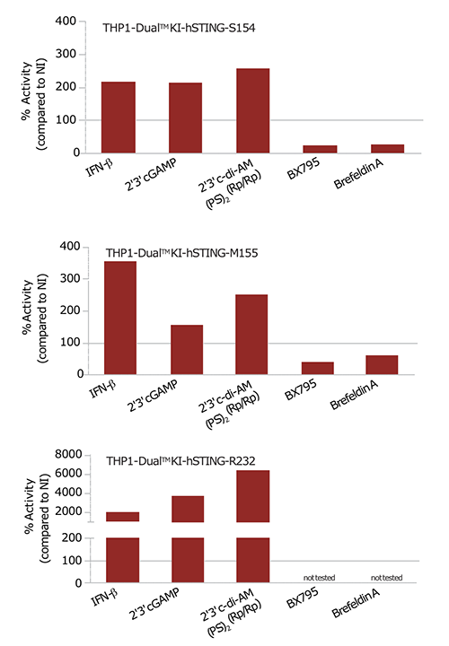 功能獲得(Gain-of-function)的活化-THP1-Dual? KI-hSTING-S154細(xì)胞和THP1-Dual? KI-hSTING-M155細(xì)胞均均可以持續(xù)活化ISG,而THP-1-Dual? KI-hSTING-R232卻不能。加入IFN-β或STING激動劑將進(jìn)一步促進(jìn)ISG的活化。注意,結(jié)果已被非刺激細(xì)胞背景信號標(biāo)準(zhǔn)化。因為其持續(xù)活化STING的特性,SAVI細(xì)胞的背景非常高,誘導(dǎo)ISG應(yīng)答的增加倍數(shù)低于R232對照細(xì)胞。