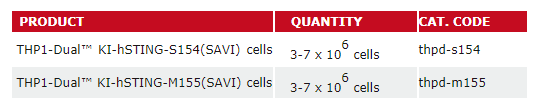 InvivoGen提供給一系列基于人源THP1單核細(xì)胞系的STING突變體的報告基因細(xì)胞株。其中,有兩款表達(dá)STING- associated vasculopathy with onset in infancy(SAVI)的功能獲得性突變體(S154 and M155)。SAVI患者在STING蛋白中顯示出單一突變,導(dǎo)致其持續(xù)激活和ISG的過度活化。S154是新生突變[1],M155是遺傳突變[2]。STING SAVI報告基因細(xì)胞株是篩選STING通路抑制劑便捷有力的工具。