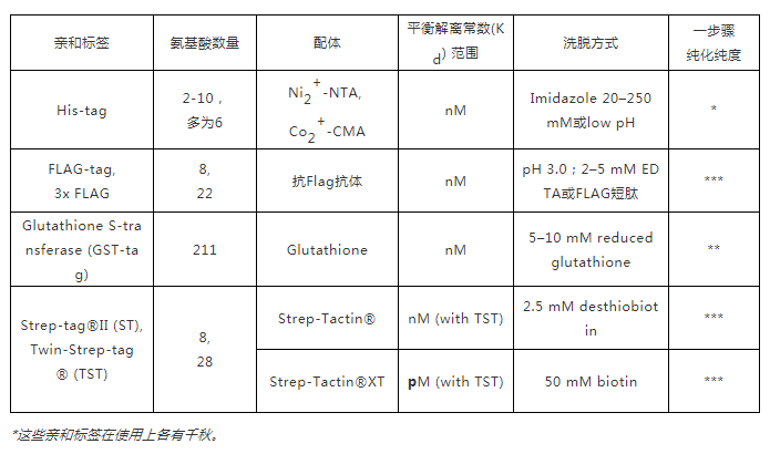 首先,需考慮選擇合適的親和標(biāo)簽。常用于哺乳動物表達(dá)系統(tǒng)的親和標(biāo)簽有His-tag、FLAG-tag、GST-tag及Strep-tag?等[4-12],整理于下表: