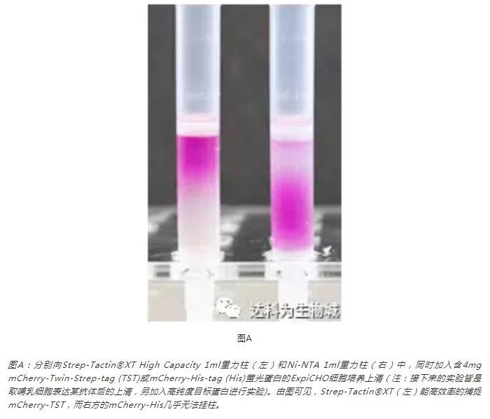 圖A比較了His-tag與Strep-tag?直接加入哺乳細(xì)胞培養(yǎng)上清純化目標(biāo)蛋白的表現(xiàn)。
