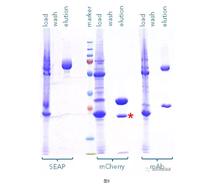 此外,我們也測試了其他的蛋白,例如SEAP(72 kDa)或抗體(mAb,其重鏈為55kDa)。圖B為以Strep-Tactin?XT純化SEAP-TST、mCherry-TST與mAb-TST的SDS-PAGE分析結(jié)果,可見對于不同蛋白,Strep-tag?系統(tǒng)都能純化出高純度的目標(biāo)蛋白。(注:紅色標(biāo)記處為 mCherry的降解產(chǎn)物,非雜帶)