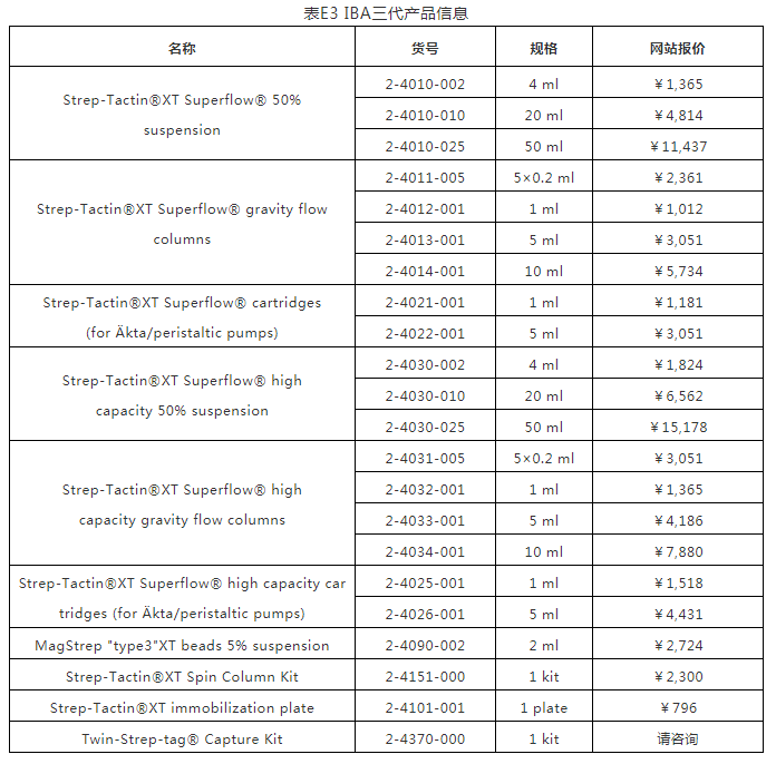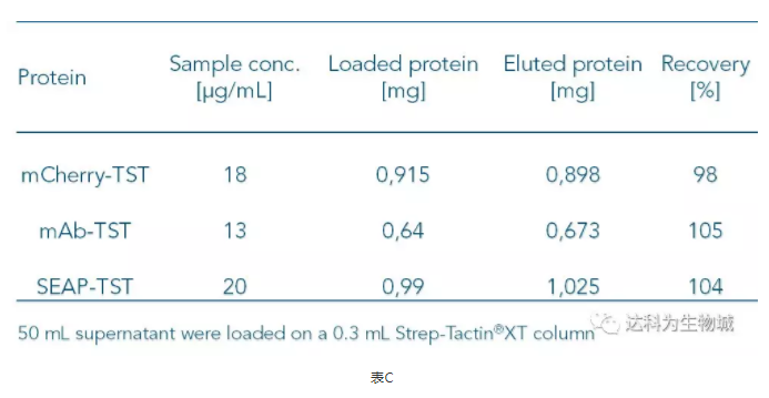 因Strep-Tactin?XT與Twin-Strep-tag蛋白的高親和力,即使目標(biāo)蛋白的濃度低,使用Strep-Tactin?XT仍可以有效的捕捉上清中的目標(biāo)蛋白。表C整理了幾個實(shí)驗(yàn)的數(shù)據(jù),顯示當(dāng)目標(biāo)蛋白濃度低于20μg/ml時,得率仍能達(dá)到幾近100%。