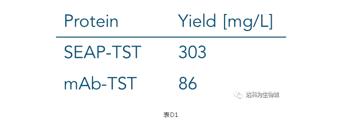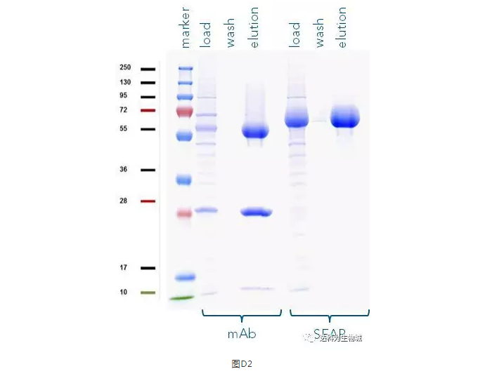 除了上述實(shí)驗(yàn)所用的CHO細(xì)胞株外(中國倉鼠卵巢細(xì)胞),另一常用于生產(chǎn)蛋白的哺乳動物細(xì)胞株為HEK293(人胚胎腎細(xì)胞),使用上較CHO簡單。我們測試了Strep-Tactin?XT的純化表現(xiàn):表D1為以Expi293表達(dá)SEAP-TST或mAb-TST蛋白后,目標(biāo)蛋白的濃度。圖D2為純化表現(xiàn)的SDS-PAGE分析。從中可知,與ExpiCHO培養(yǎng)基相同,直接將表達(dá)好的Expi293上清加入1ml Strep-Tactin?XT高載量重力柱中進(jìn)行純化,一樣能夠快速的得到高純度的目標(biāo)蛋白。
