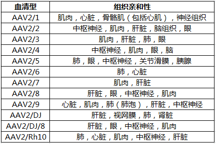 目前發(fā)現(xiàn)的AAVAAV1~AAV11DJ12種不同的血清型,主要區(qū)別在于衣殼蛋白Cap的不同,并決定不同血清型AAV對不同的組織和細(xì)胞有不同的感染效率。