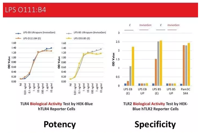 比較InvivoGen和E品牌TLR4特異性LPS(Utrapure)發(fā)現(xiàn),E品牌雖然號稱TLR4 specific agonist,但是可同時(shí)激活TLR2和TLR4,而InvivoGen的Ultrapure LPS只能特異性激活TLR4。
