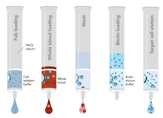 Fab-TACS柱子填充了包被有Strep-Tactin? 多聚體的細(xì)胞級(jí)瓊脂糖基質(zhì),偶聯(lián)上Strep-tag的Fab片段(Fab-Streps)特異性的結(jié)合到瓊脂糖基質(zhì)上。隨后,加入全血或其他血液制劑流過(guò)柱子。目的細(xì)胞通過(guò)特異性的與Fab-Streps作用從而結(jié)合到瓊脂糖基質(zhì)上,其他非目的細(xì)胞則有效的被洗去。最后,加入生物素使目的細(xì)胞從Fab-Streps上解離。至此,就已分離得到不帶任何標(biāo)記的、真實(shí)的目的細(xì)胞可用于下游的實(shí)驗(yàn)研究。