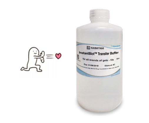 當(dāng)然蛋白電泳只是WB實(shí)驗(yàn)的第一步,那還有什么方法能加快后續(xù)實(shí)驗(yàn)(如轉(zhuǎn)膜)進(jìn)程呢?別急,今天就給大家介紹一款來自分子產(chǎn)品專家Expedeon公司的快速轉(zhuǎn)膜液——InstantBlot?Transfer Buffer貨號(hào):NXB87500),作為Expedeon的一款專利產(chǎn)品,該轉(zhuǎn)膜液能夠大幅提升蛋白從“膠”至“膜”的轉(zhuǎn)移速度,最快只需10 min即可完成轉(zhuǎn)膜,并且不會(huì)產(chǎn)生過多的熱量,避免影響蛋白的后續(xù)檢測。
