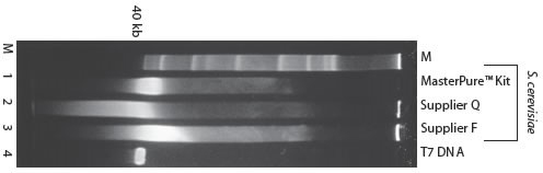 1%瓊脂糖膠電泳分析不同試劑盒提取純化啤酒酵母的500ng DNA,使用EB進(jìn)行染色。用MasterPure? Kit分離的DNA的大小絕大多數(shù)在40-50 kb范圍內(nèi)。用其它試劑盒提取的DNA會(huì)降解成更小的片段。