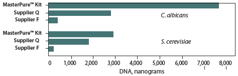 分別提取S.cerevisiaeC. albicans.中的DNA,用熒光染料33258對(duì)DNA進(jìn)行定量分析(RNA對(duì)該定量幾乎沒有影響)。圖中顯示的是兩次實(shí)驗(yàn)的平均DNA得率 。MasterPure Kit對(duì)C.albicans的提取量相比其它試劑盒高17倍;對(duì)S. cerevisiae的提取量相比其它試劑盒高12倍。