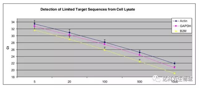 隨著HeLa細(xì)胞數(shù)的增加,分別用適量細(xì)胞裂解液裂解細(xì)胞后進(jìn)行反轉(zhuǎn)錄,而后在7700 PCR儀上進(jìn)行Actin、GAPDH和B2M基因的3復(fù)孔qPCR反應(yīng)。