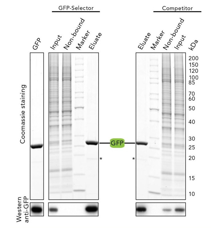 • 將等量GFP Selector和競爭產品與1ml含GFP標記蛋白的HeLa裂解物一起孵育,通過考馬斯染色和蛋白印跡分析上樣、洗滌產物、洗脫產物。