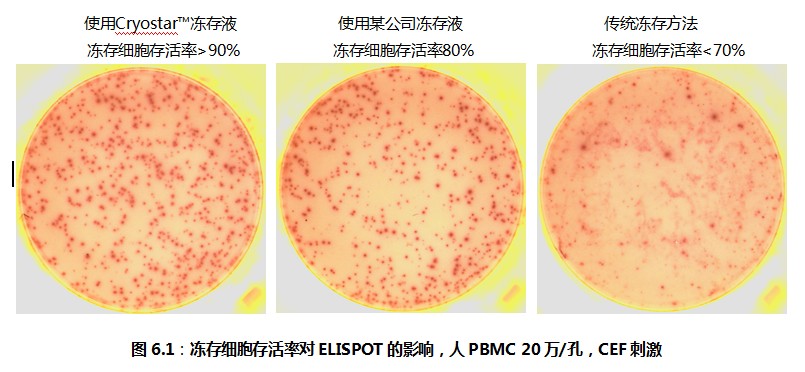 考慮到ELISPOT檢測(cè)的特殊性,荷蘭U-CyTech公司經(jīng)過(guò)精心的研究與反復(fù)的驗(yàn)證,推出Cryostar?凍存試劑盒,在凍存液中添加了一系列對(duì)細(xì)胞有特殊保護(hù)作用的保護(hù)劑。達(dá)科為公司在接到Cryostar?凍存試劑盒之后,在我們的實(shí)驗(yàn)室以及國(guó)內(nèi)數(shù)家客戶的實(shí)驗(yàn)室做了細(xì)胞凍存與復(fù)蘇的實(shí)驗(yàn),并且對(duì)復(fù)蘇之后的細(xì)胞做了ELISPOT檢測(cè)。結(jié)果表明,淋巴細(xì)胞的存活率超過(guò)90%,ELISPOT斑點(diǎn)形成頻率與新鮮細(xì)胞完全相同。參見(jiàn)圖6.1。