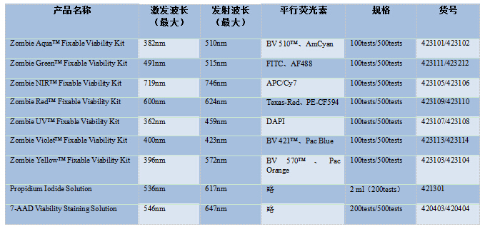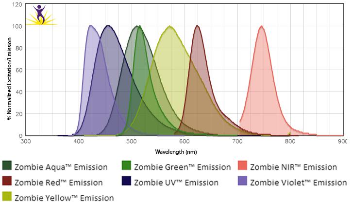 Zombie Dyes有別于PI和7-AAD等DNA染料,它是一種可用于需固定細胞實驗的染料,通過與細胞上蛋白質(zhì)的氨基結(jié)合來實現(xiàn)。因活細胞可排除染料,所以僅細胞膜被著色;而死細胞的細胞膜及細胞質(zhì)均被著色,繼而根據(jù)熒光信號的強弱來區(qū)分死/活細胞。而且Zombie Dyes可選擇性多,可以由不同的激發(fā)光激發(fā),便于靈活選擇。
