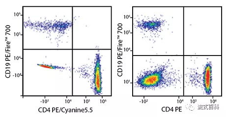 在5激光Cytek? Aurora 光譜流式平臺上,檢測人裂紅后外周血的CD4和CD19。PE/Fire? 700-CD19和PE/Cyanine5.5-CD4共染方案與PE/Fire? 700-CD19和PE-CD4共染方案得到了相似得陽性信號,說明在光譜流式平臺PE/Fire? 700和PE/Cyanine5.5是有可能在一個panel中共用的,但是配色方案可以更加優(yōu)化。