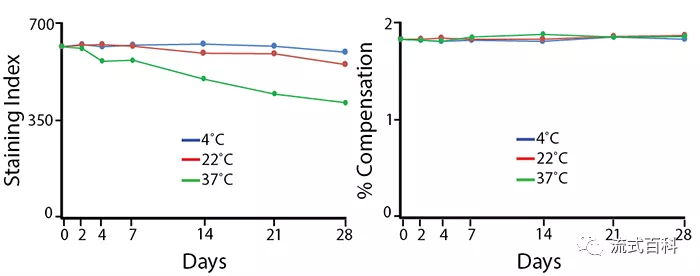將PE/Fire? 700標(biāo)記的抗體分裝后分別保存在4℃、22℃和37℃下。穩(wěn)定性可以根據(jù)抗體的染色指數(shù)(staining index)和熒光補償百分比來衡量,隨著保存時間的延長,3種溫度保存條件下光補償百分數(shù)并沒有發(fā)生改變,但是37℃的保存條件染色指數(shù)下降了約36%,22℃保存條件的染色指數(shù)下降了約12%,這主要是由于這兩種保存條件下抗體的非特異性染色背景升高引起的(檢測平臺為5激光Cytek? Aurora 光譜流式)。