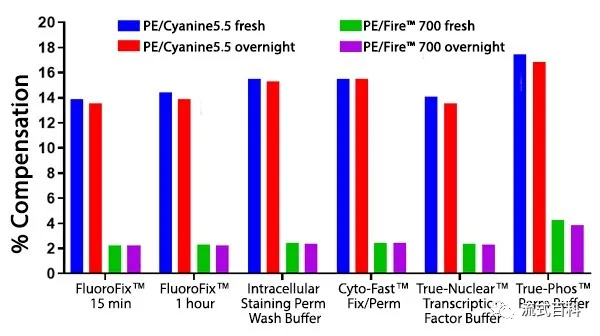 PE/Fire? 700 和PE/Cyanine5.5標(biāo)記的兩種CD4抗體檢測人裂紅外周血,抗體孵育完成后在固定洗滌馬上去檢測條件下和過夜后的條件下,在5激光Cytek? Aurora 光譜流式平臺檢測,PE/Fire? 700 在不同的實驗方案中對多聚甲醛的固定具有穩(wěn)定的抗性,表現(xiàn)出比PE/Cyanine5.5更優(yōu)秀的穩(wěn)定性,但是在磷酸化指標(biāo)的檢測方案中,PE/Fire? 700熒光素的穩(wěn)定性出現(xiàn)了一定程度的下降。