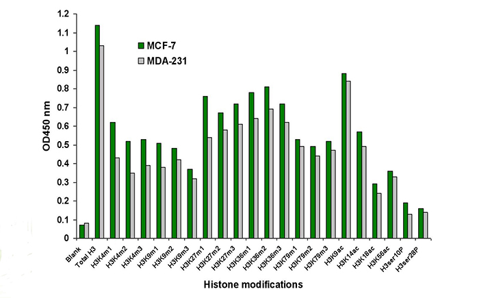 該試劑盒檢測H3修飾位點(diǎn):H3K4me1 、H3K4me2、H3K4me3、H3K9me1、H3K9me2 、H3K9me3、H3K27me1、H3K27me2、H3K27me3、H3K36me1、H3K36me2、H3K36me3、H3K79me1、H3K79me2、H3K79me3、H3K9ac、H3K14ac、H3K18ac、H3K56ac、H3ser10P、H3ser28P、TotalH3