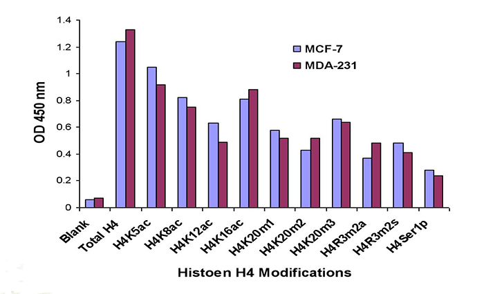 該試劑盒檢測H4修飾位點(diǎn):H4K5ac、H4K8ac、H4K12ac、H4K16ac、H4R3m2a、H4R3m2s、H4K20m1、H4K20m2、H4K20m3、H4ser1、TotalH4
