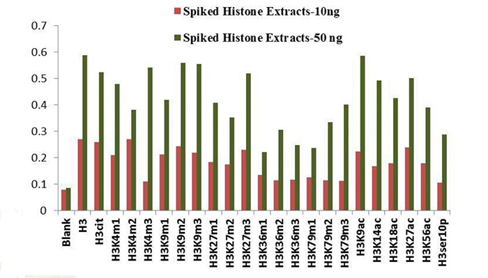該試劑盒檢測H3修飾位點(diǎn):H3K4me1 、H3K4me2、H3K4me3、H3K9me1、H3K9me2 、H3K9me3、H3K27me1、H3K27me2、H3K27me3、H3K36me1、H3K36me2、H3K36me3、H3K79me1、H3K79me2、H3K79me3、H3K9ac、H3K14ac、H3K18ac、H3K27ac、H3K56ac、H3ser10P、H3cit、TotalH3