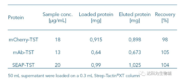 因Strep-Tactin?XT與Twin-Strep-tag蛋白的高親和力,即使目標(biāo)蛋白的濃度低,使用Strep-Tactin?XT仍可以有效的捕捉上清中的目標(biāo)蛋白。表C整理了幾個實驗的數(shù)據(jù),顯示當(dāng)目標(biāo)蛋白濃度低于20μg/ml時,得率仍能達到幾近100%。