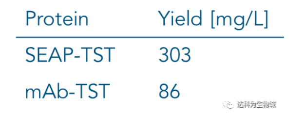 除了上述實驗所用的CHO細胞株外(中國倉鼠卵巢細胞),另一常用于生產(chǎn)蛋白的哺乳動物細胞株為HEK293(人胚胎腎細胞),使用上較CHO簡單。我們測試了Strep-Tactin?XT的純化表現(xiàn):表D1為以Expi293表達SEAP-TST或mAb-TST蛋白后,目標(biāo)蛋白的濃度。圖D2為純化表現(xiàn)的SDS-PAGE分析。從中可知,與ExpiCHO培養(yǎng)基相同,直接將表達好的Expi293上清加入1ml Strep-Tactin?XT高載量重力柱中進行純化,一樣能夠快速的得到高純度的目標(biāo)蛋白。